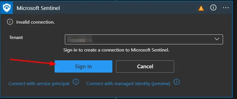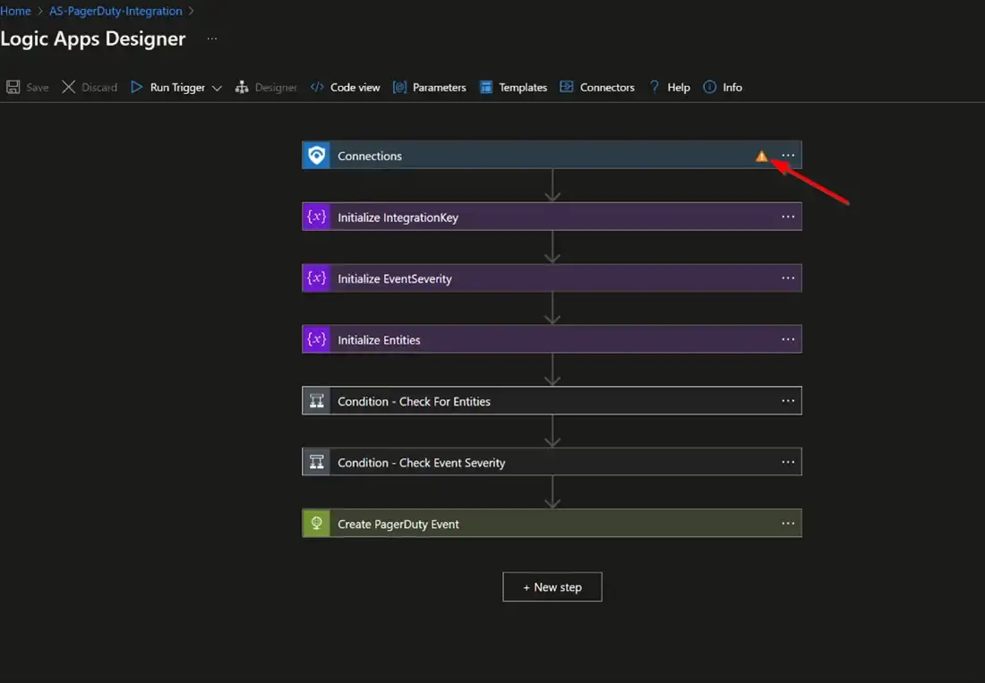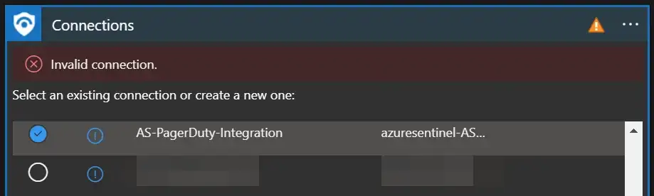 To validate the connection created for this playbook, expand the “Connections” step and click the exclamation point icon next to the name matching the playbook.